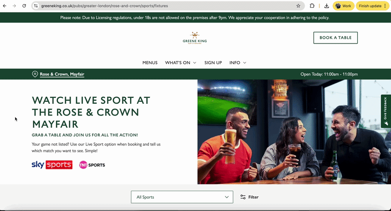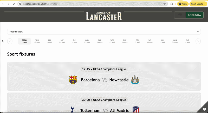 Why it works: Perfectly matches the company’s brand, clear table booking CTA, has all the relevant info for each game (competition, badges, team names, KO time, channel.)